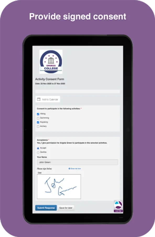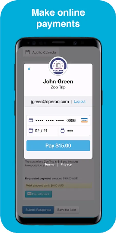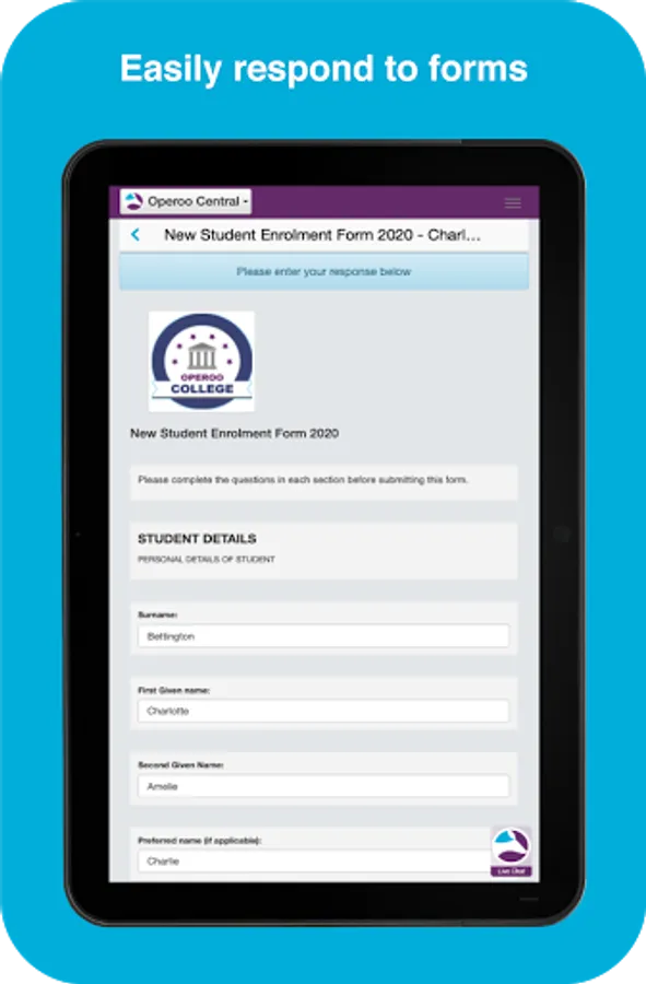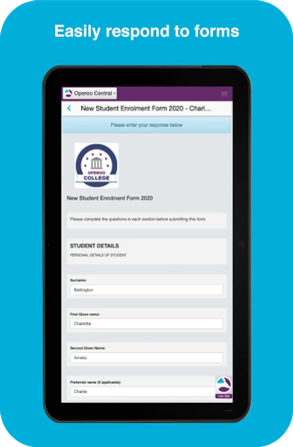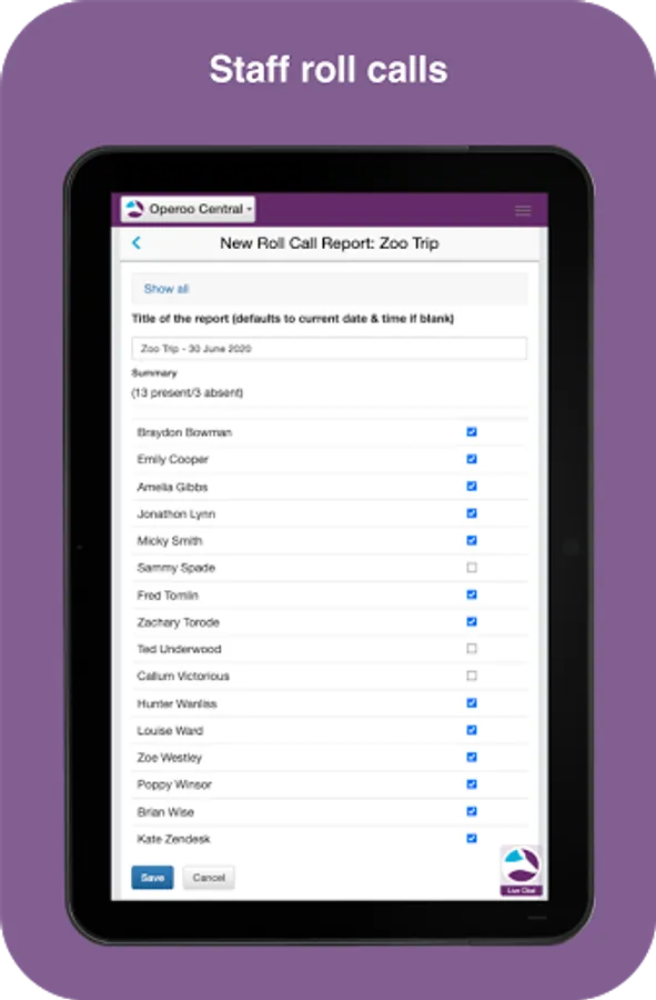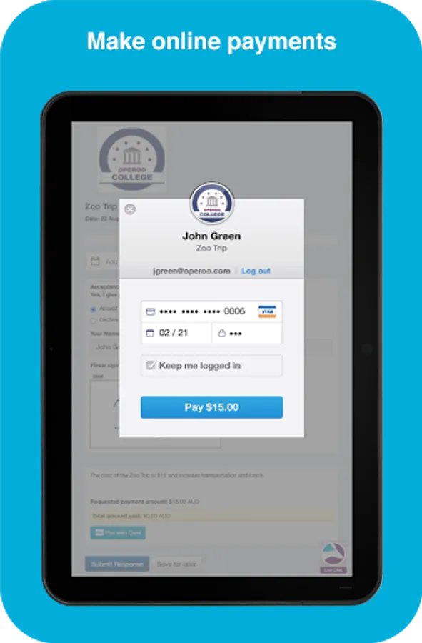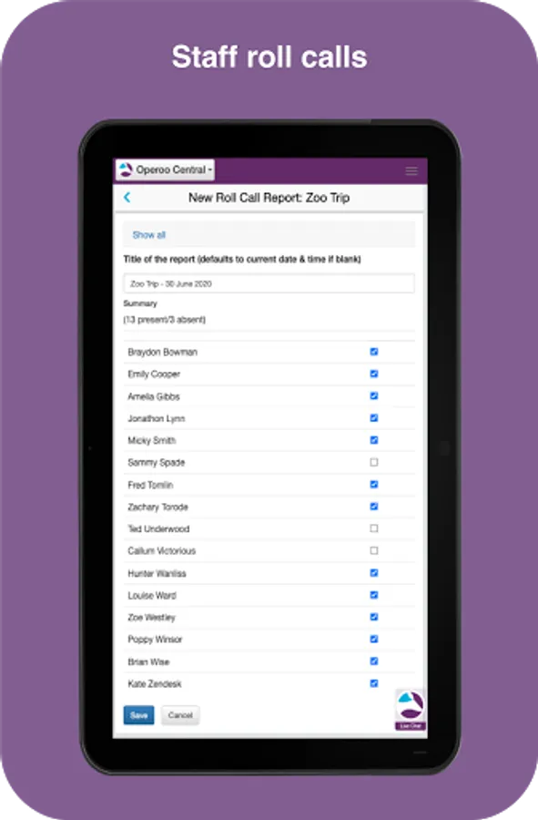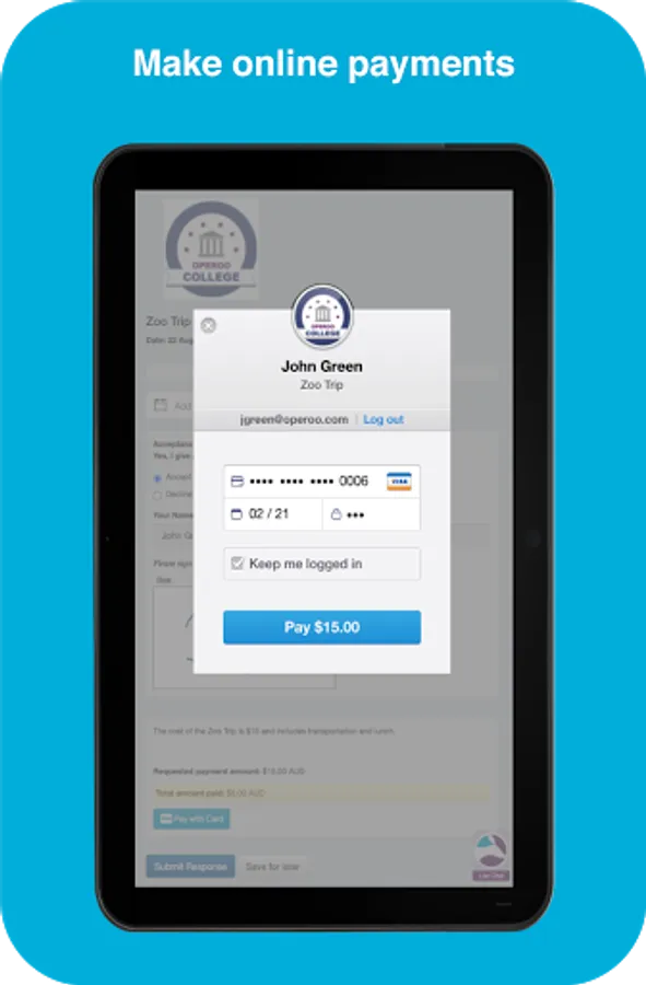Parents use the Operoo Central App to respond to school forms, make payments and receive messages. Staff use the Operoo Central App to manage trips, mark the roll, log incidents, review medical data in an emergency, respond to staff forms and receive messages.