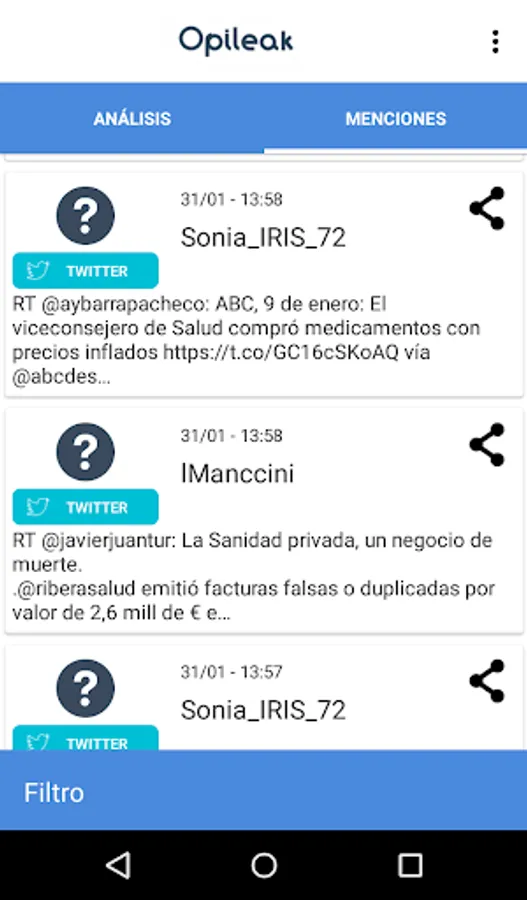 Access all comments, posts and pages our platform recognized by listening. Meet the topics of the last hour, and mark the contents of interest for further analysis. Sign in www.opileak.es to access the service.