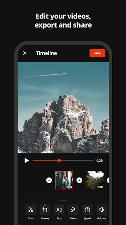 Trim, add Music, Emojis, Text, etc. in an easy to edit timeline.