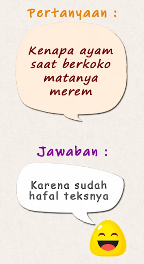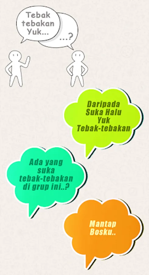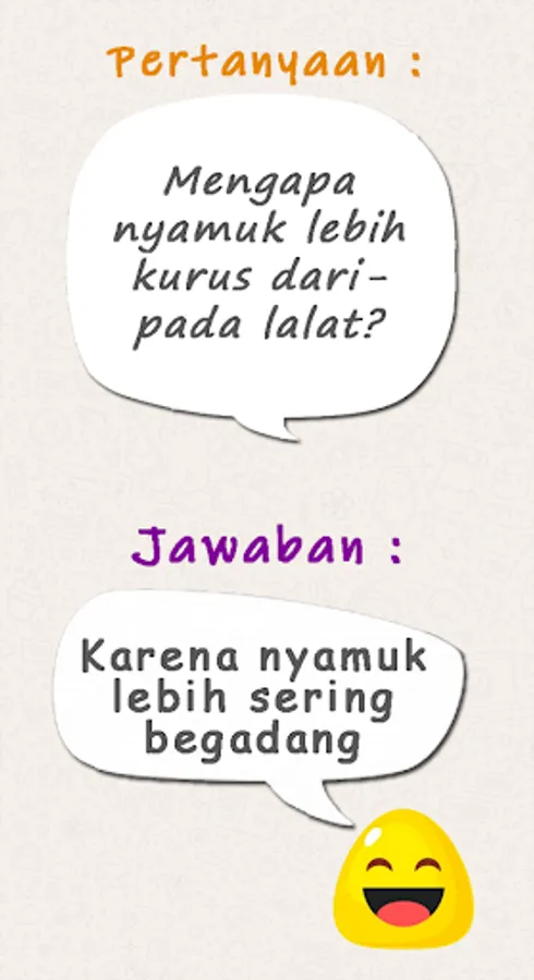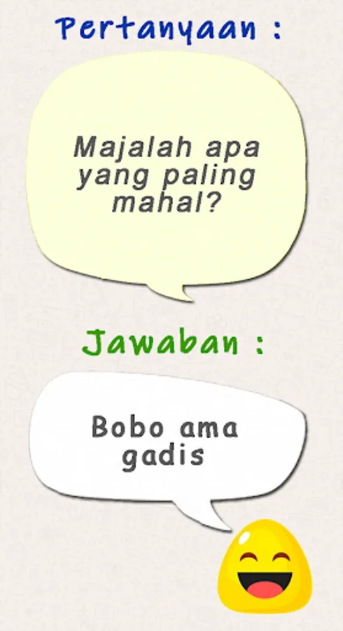Sometimes we are boring grouped because the contents are all that and confused looking for other discussion, therefore we enliven whatsapp group by guessing funny guesses with chat whatsapp in the form of a funny quiz question and answer that makes laughter and make the group want to participate in answering the crazy questions and keep laughing because this funny sticker quiz is only here and there are lots of funny questions accompanied by answers, so let's play funny puzzles in chat wa and make everyone laugh happily.