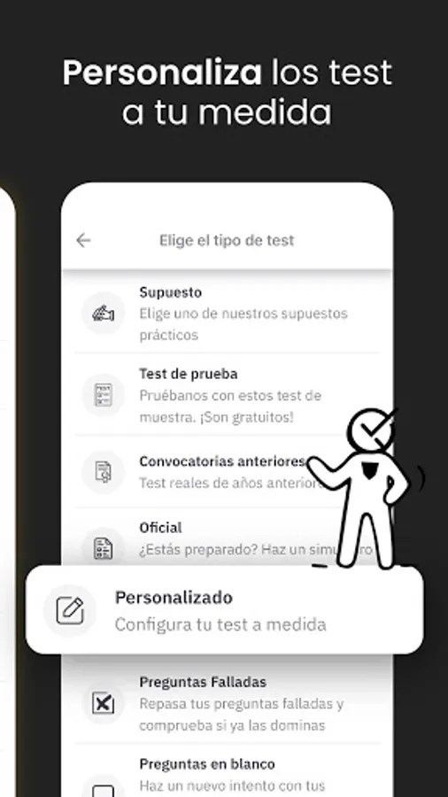 Prepare your tests wherever and whenever you want with the OpositaTest app. You will take offline tests, personalized tests by subjects, topics, failed questions, blank questions, drills, official exams ... The tests are always random and different!