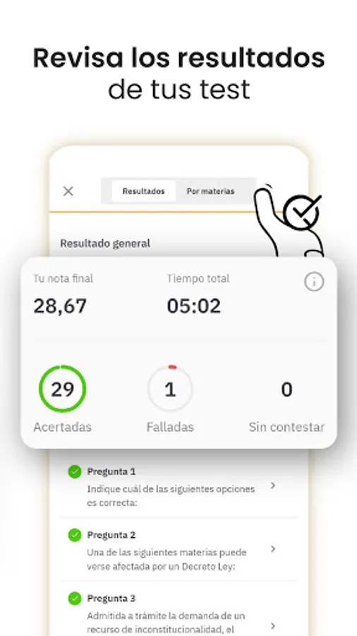 Thanks to an analysis of your results, you will know your true level at all times. Find out in which topics you fail the most and how your progress has been since you use OpositaTest.