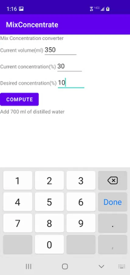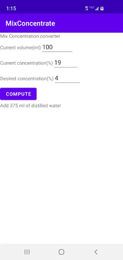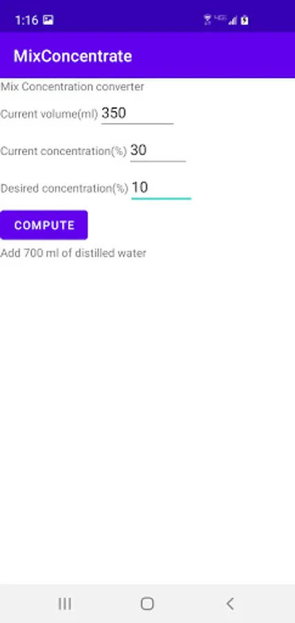 This tool computes the volume of distilled water to add into a a given mix to obtain a new mixture with lower concentration.