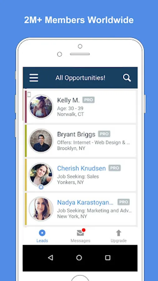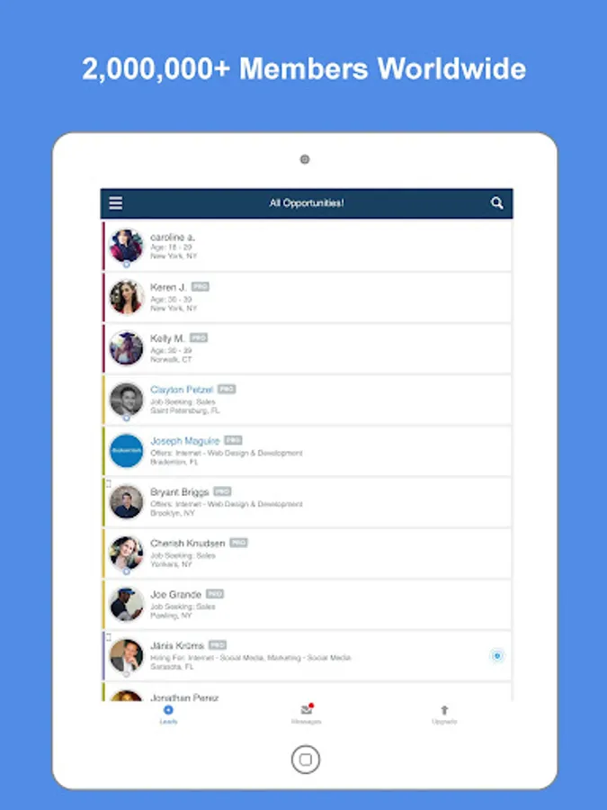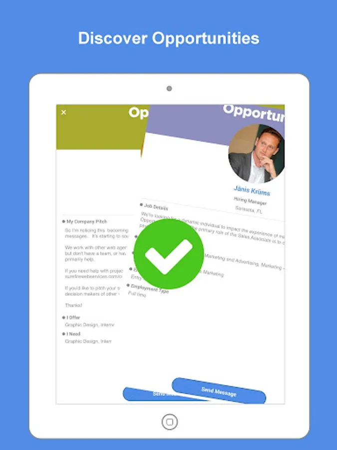 Opportunity is an online business network that uses a matching algorithm to find you business opportunities happening all around you and beyond. Using information you enter into your profile combined with enabled location services, Opportunity is able to match you with people who can provide you with immediate sales opportunities, employment, and more.