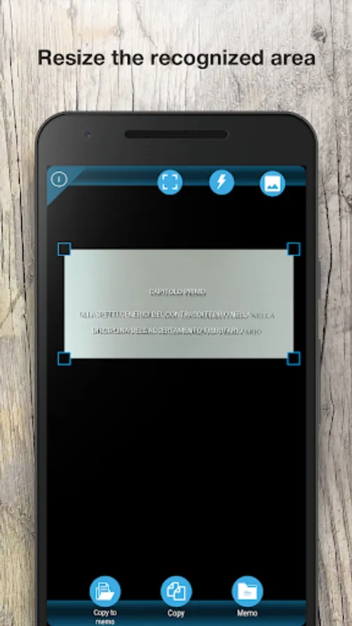 Focus the text to scan with the camera and just wait till the ocr recognizes it and show up on the screen. It's updated in real-time. You can use manual focus or zoom and you can resize the recognized area. The perfect documents scanner!