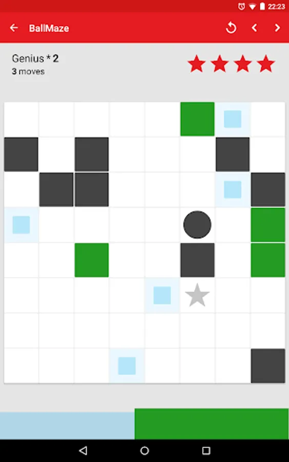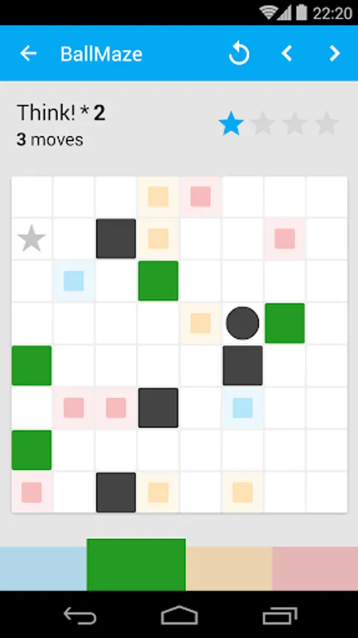 The ball rolls until it hits an obstacle. Blocking fields have different colors and you can select which color blocks the ball.