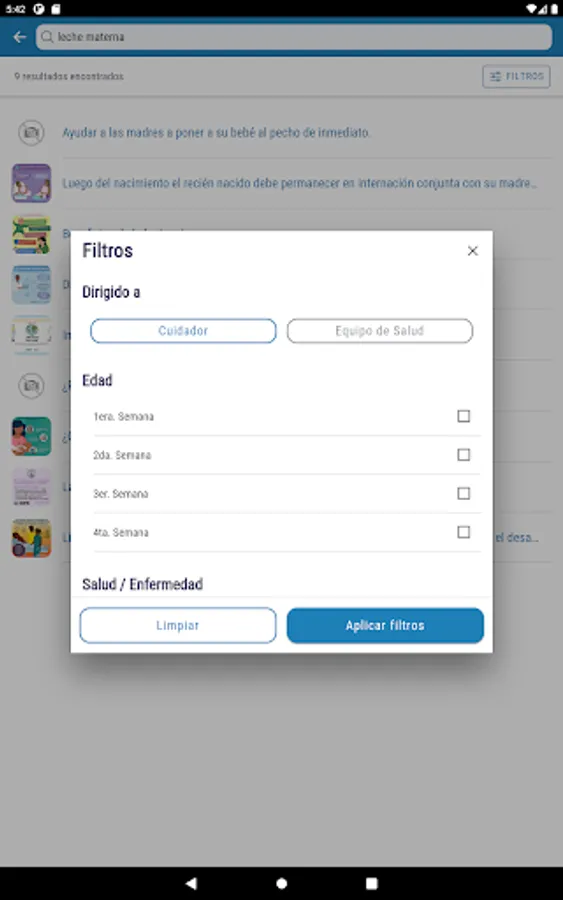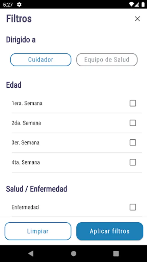 The application was developed considering two user profiles: caregivers and health teams. This allows to orient the contents with specificity and present them according to the needs and particular requirements of each user.