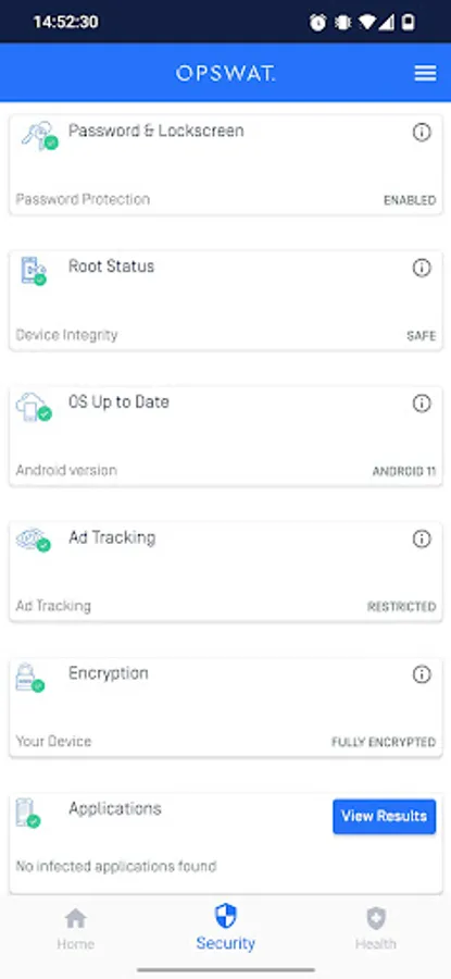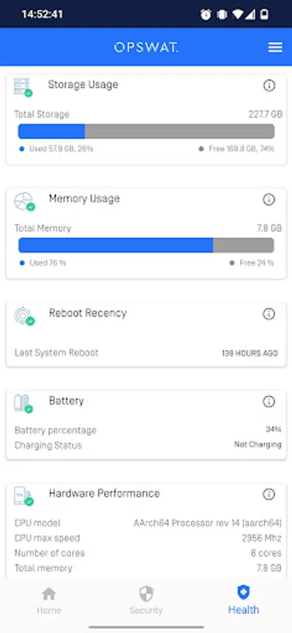 If your device has been slow or unstable, OPSWAT Mobile App also provides a health report with instructions for correcting stability issues like insufficient free memory or an out-of-date operating system.