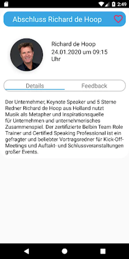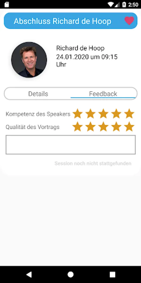 With this app, participants can put together their own schedule of the event, get access to the program with information about the speakers and the schedule of the sessions. With the favorites function, the highlights can be marked and always kept in view. There is also the option to send feedback on the event: Participants can rate the individual sessions and the entire event directly in the app.