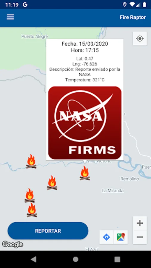 Fire Raptor allows us to be in contact with government entities and receive reports in Near Real Time of the fire information generated by NASA® satellites in Colombia, in addition to reporting events in real time by users.