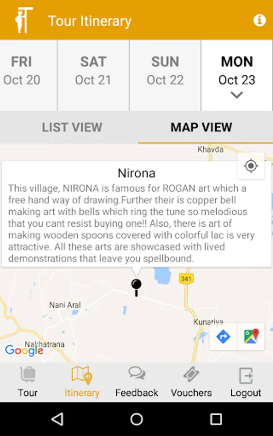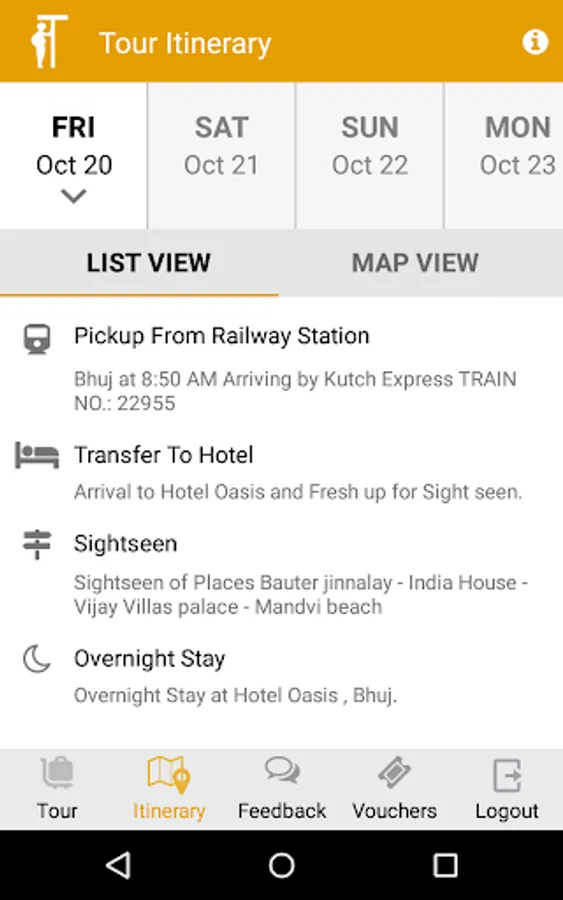 The app provides you the description of the package you selected, along with the services you will be provided with, Tour itinerary at your finger tips , also it provides the detailed description of your tour itinerary. The benefit of tour itinerary is you can preplan how you want to get dressed or whether you have to get up early or not, etc.. We provided two forms of the itinerary- one in list view and other in map view for convenience of our customers.