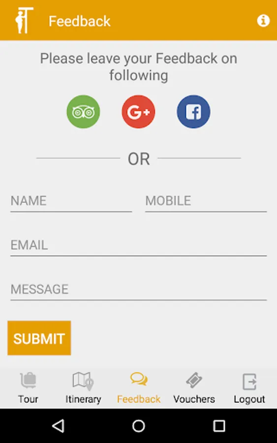 In case you don’t like the service provided by us you can freely share your feedbacks through this app. You can share your valuable feedback on trip advisor, Google +, facebook or you can also message us!