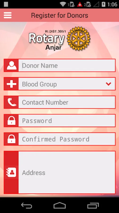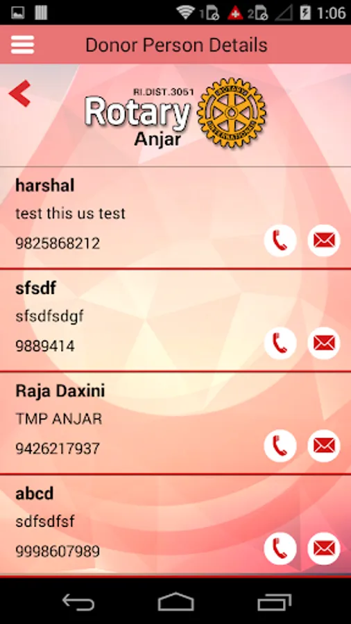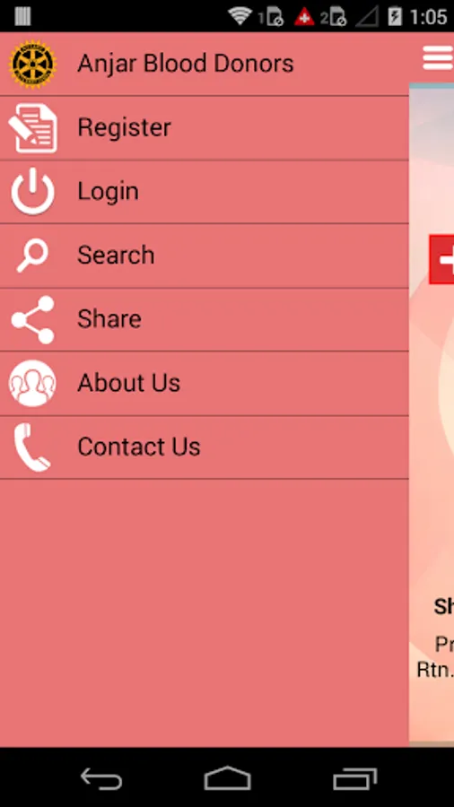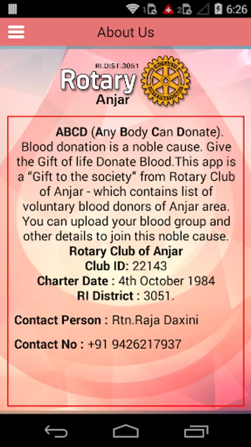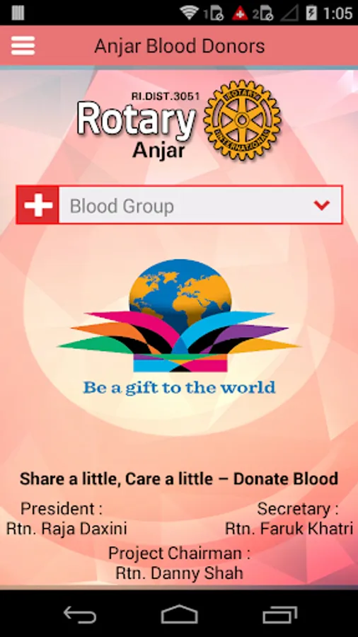 ABCD (Any Body Can Donate). Blood donation is a noble cause. Give the Gift of life Donate Blood. This app is a “Gift to the society” from Rotary Club of Anjar - which contains list of voluntary blood donors of Anjar area. You can upload your blood group and other details to join this noble cause.Rotary Club of Anjar - Club ID: 22143 Charter Date 4th October 1984 RI District 3051