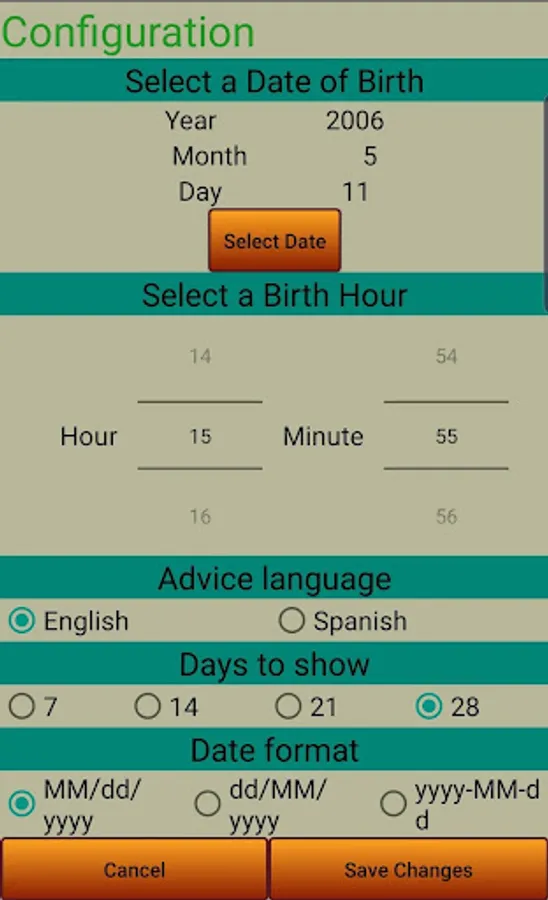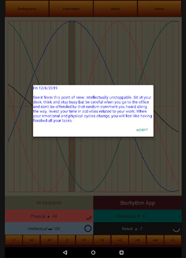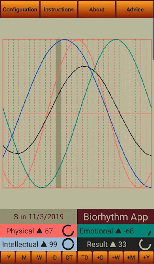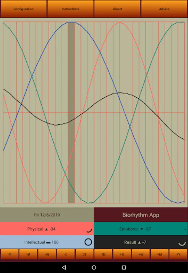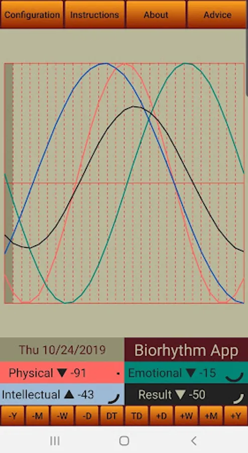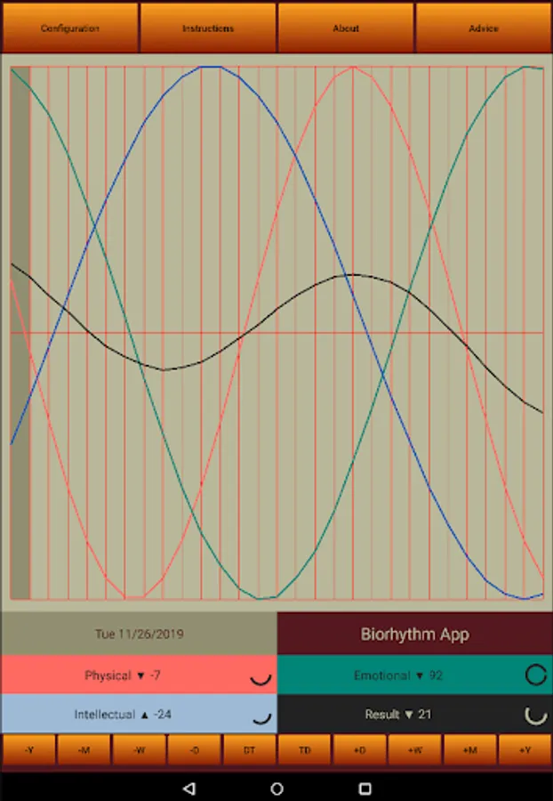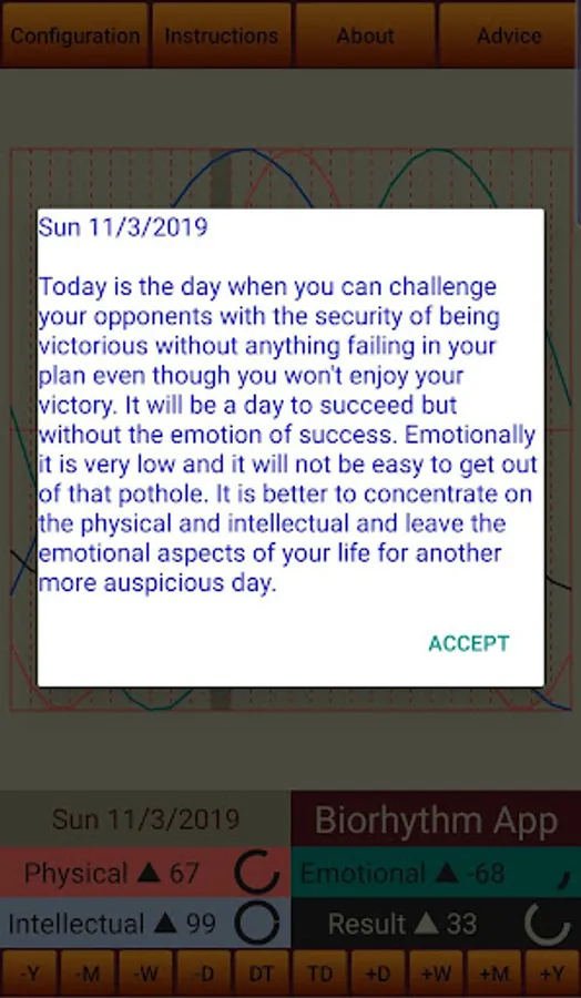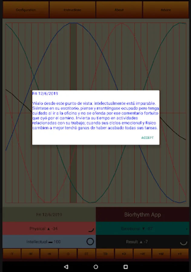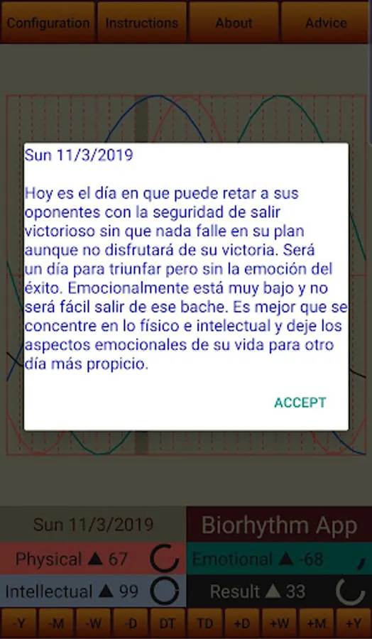 The theory of biorhythms is a theory that claims our daily lives are significantly affected by rhythmic cycles. A biorhythm is an attempt to predict various aspects of a person's life through simple mathematical cycles. The theory was developed by Wilhelm Fliess in the late 19th century. This application include daily advices in English/Spanish.
