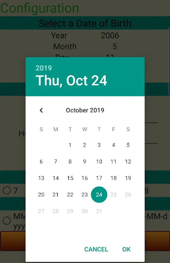1.1. Press 'Select Date' button to select a date of birth: Pick a year from the display to select a year of birth. Continues with month and day. Press OK.