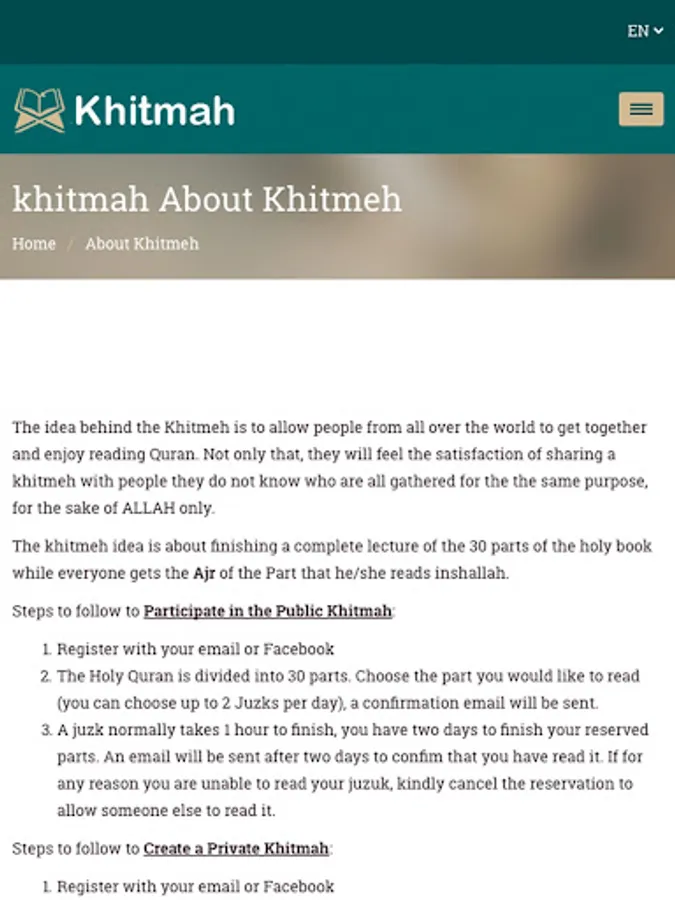 The idea behind the Khitmeh is to allow people from all over the world to get together and enjoy reading Quran. Not only that, they will feel the satisfaction of sharing a khitmeh with people they do not know who are all gathered for the the same purpose, for the sake of ALLAH only.
