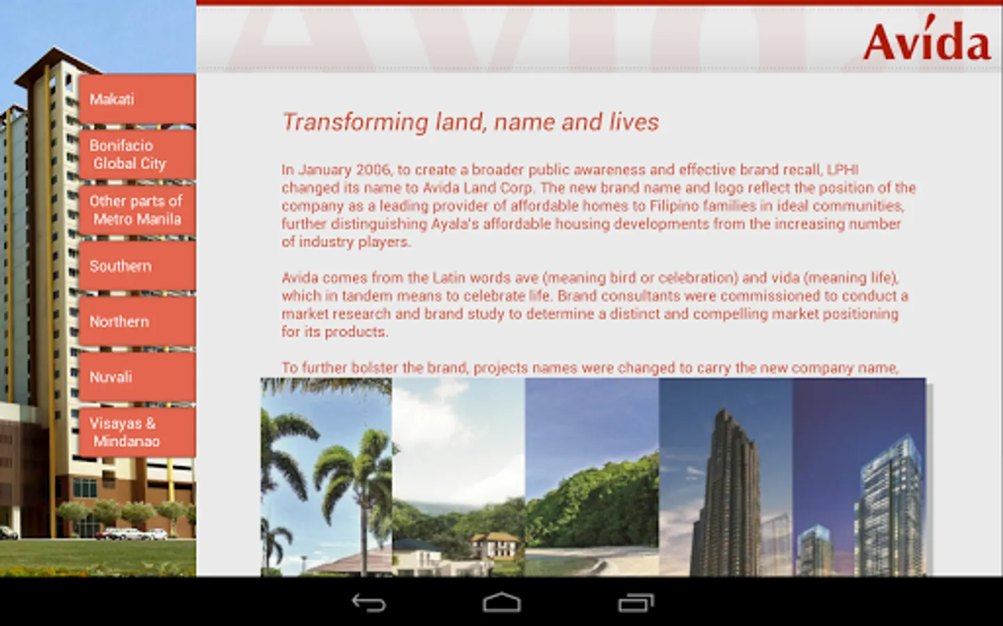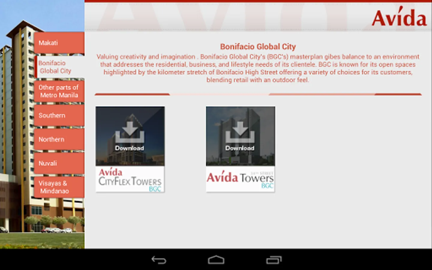 Avida Land Sales Kit is an interactive app where users can access the unique Overview, Features and Amenities, Location and Gallery of the different properties thereby giving customers a unique buying experience. This is our way of reaching out to all clients, wherever they are.
