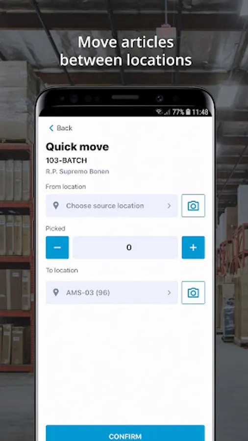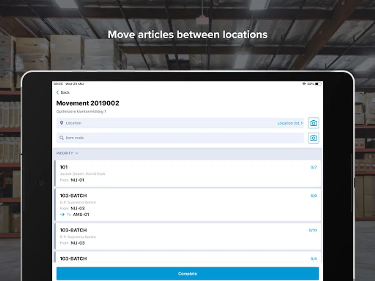 You can now move items with instant processing in your ERP by scanning with App4Picking. Scan the location and the item at the place you are taking the goods and do the same thing at the place where you put the goods back into storage. These transactions are processed directly in the ERP. You can find an overview of the movements in the CMS.