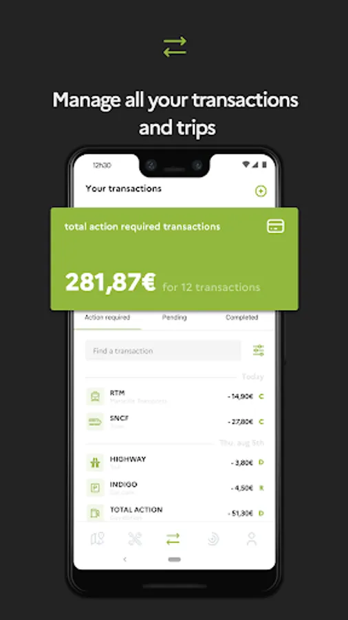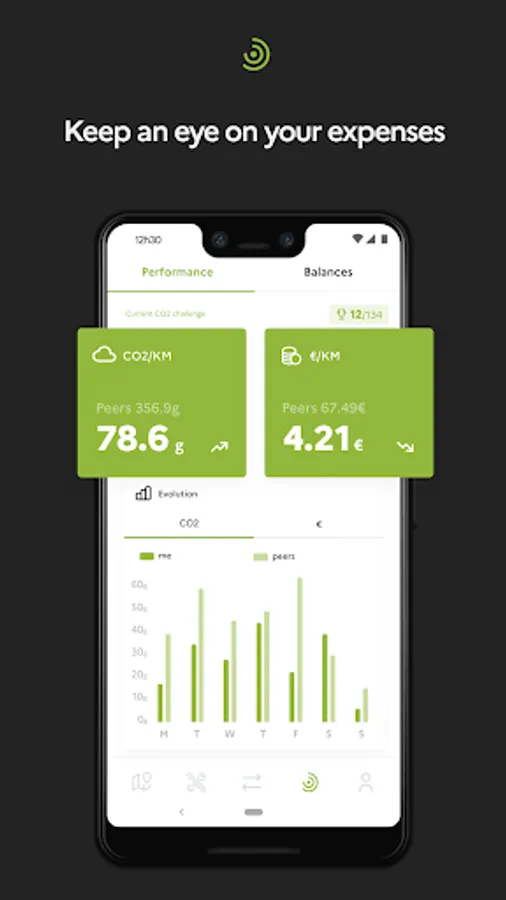 And in your dashboard (4th menu item), you can follow up your balances (your actual costs / budget costs) and economical & environmental perfomance (expenses & CO2 per traveled km); and even join a performance group and participate in challenges organized by your employer.
