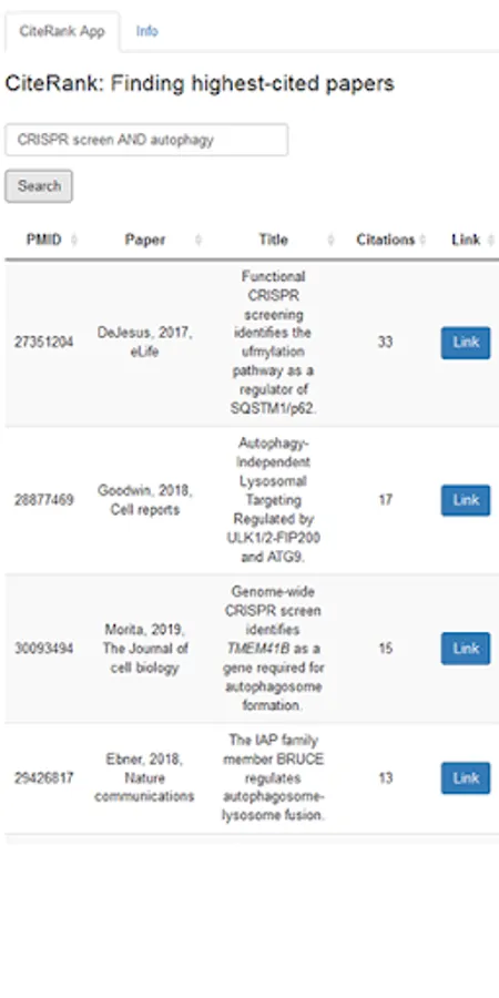 - The citation rank table also gives PubMed links for the papers for easy access (see a button on the right of the table for each paper).