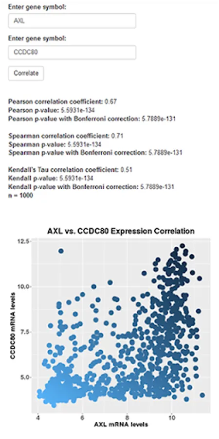 - This app performs gene expression correlation analyses for a pair of queried genes.