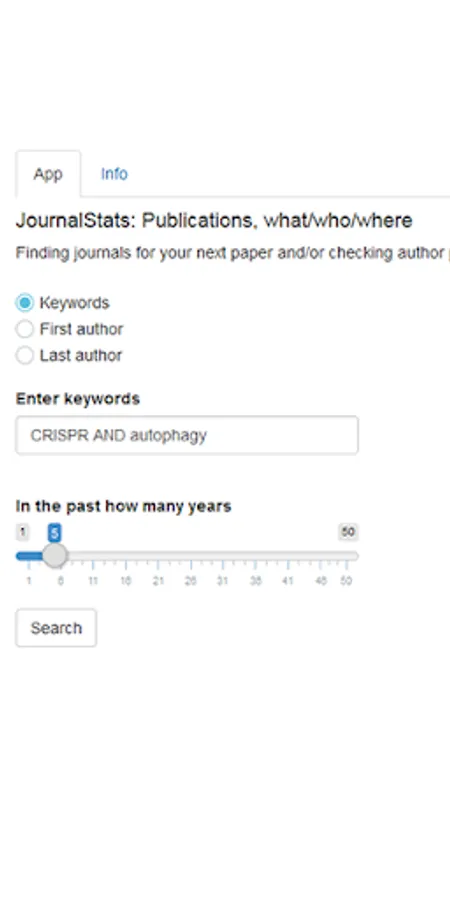 - Publication statistics using keywords, first author, or last author are determined and a table of journals and number of papers published in each journal is produced.