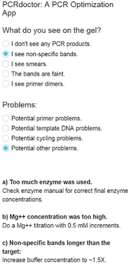 - PCRdoctor is an interactive PCR optimization app that allows the user to figure out a path to troubleshooting various PCR problems, based on the problem type seen on the gel.