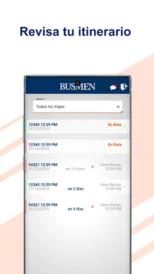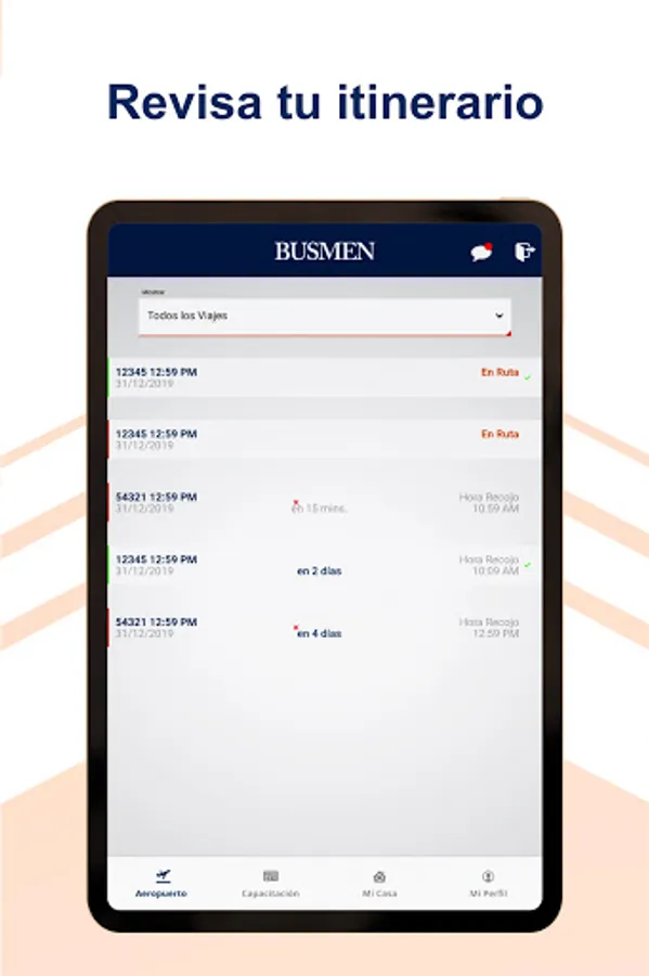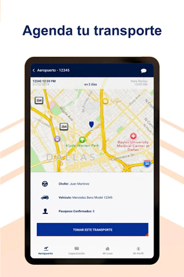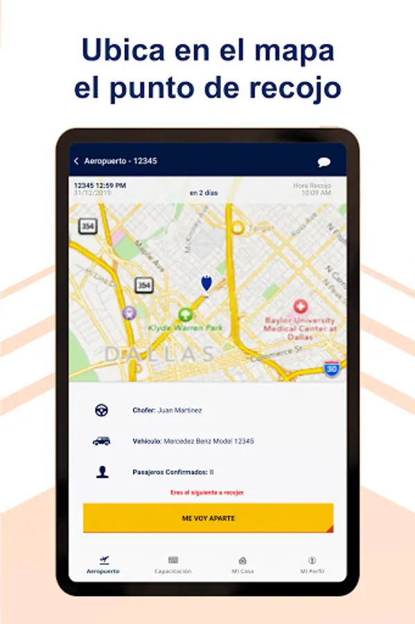• Within the main menu options "to the airport, to home and to training" the itinerary is displayed (by date shows the flights or courses) of each user to request pick-ups.