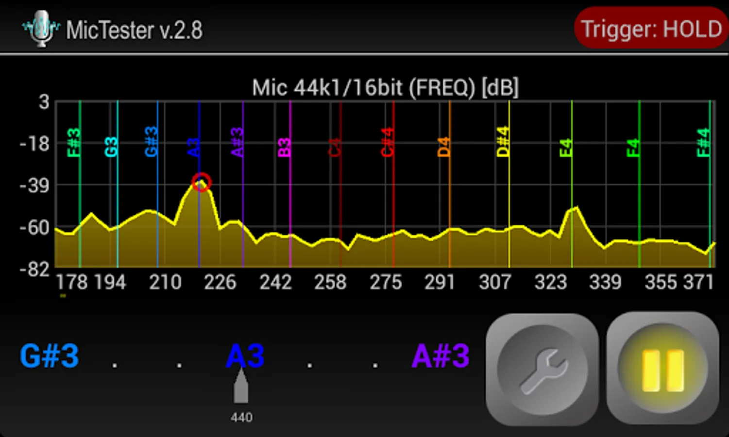 MicTester is also a Real Time Analyzer (RTA) and allows you to perform a very accurate audio spectral analysis of the signal. Automatic identification of musical notes help you to detect the pitch of a sound, making easy to tune a musical instrument or to train your own voice.