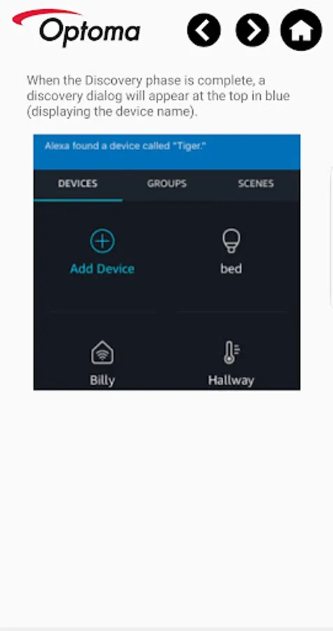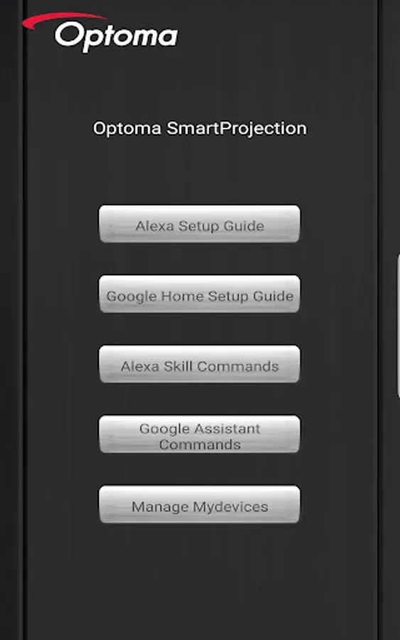 The Optoma SmartProjection app features a step-by-step Alexa Setup Guide, Google Home/Assistant Setup Guide, SmartProjection for Smart Home command list for Alexa, Optoma SmartProjection Action for Google Home/Assistant Command List and direct access to the Mydevices Cloud for registration and management of Optoma Smart Home Enabled Projectors.