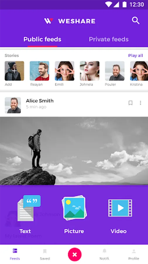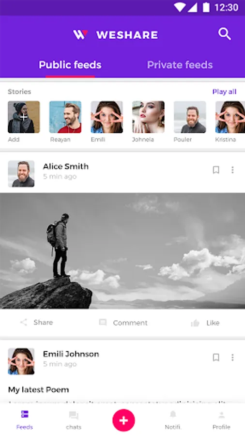 Sign in to WeShare after registering all the required details. Find public feeds, & profile details in WeShare.