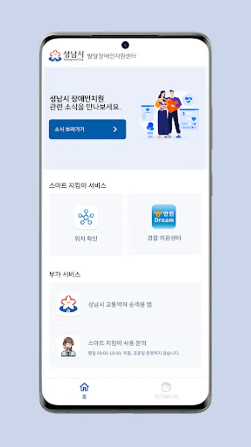 With the smart guardian of the ‘Seongnam City Developmental Disability Guard Service’, guardians can care more comfortably. Seongnam City has developed location tracking devices with local IT companies and is distributing them free of charge. In addition, you can receive the protection service in conjunction with the 'Seongnam Developmental Disability Support Center' app. In addition, you can use not only the smart guardian service, but also the additional services you need through this app.