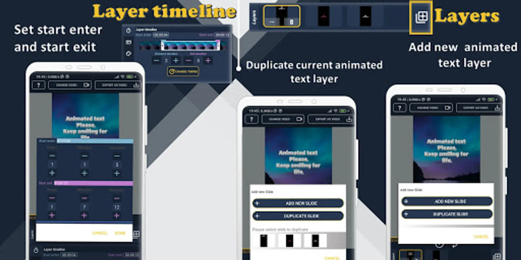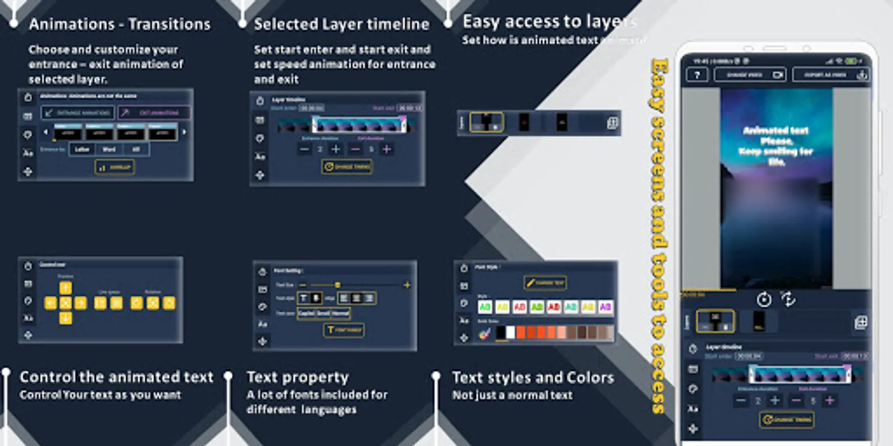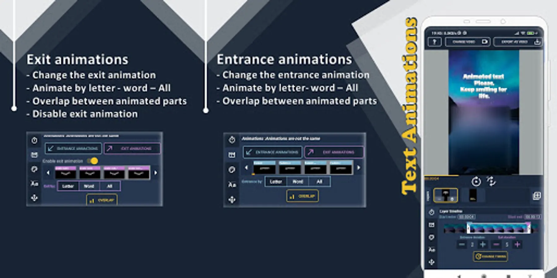 012 animated text allows you to add and customize your text animation effects on video with so many text styles and animations , you can add multi animated texts layers , change entrance and exit animation freely and easily the timing.