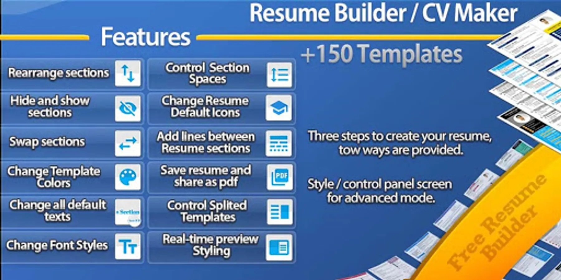 Free Resume builder / CV maker / Curriculum Vitae maker ✍ with at least +150 Resumes / CVs modern and standard templates ,In few minutes you can create a Resume – CV and save or share it as pdf , Many features are now available to you to create – Build your own (CV) Curriculum Vitae – résumé this app is suitable for interns, fresher, and experienced job seeker.
