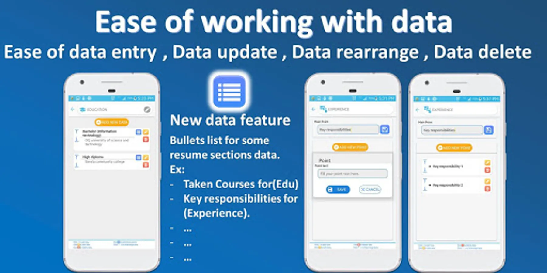 Bullets list ⁞≡ for some resume sections data.