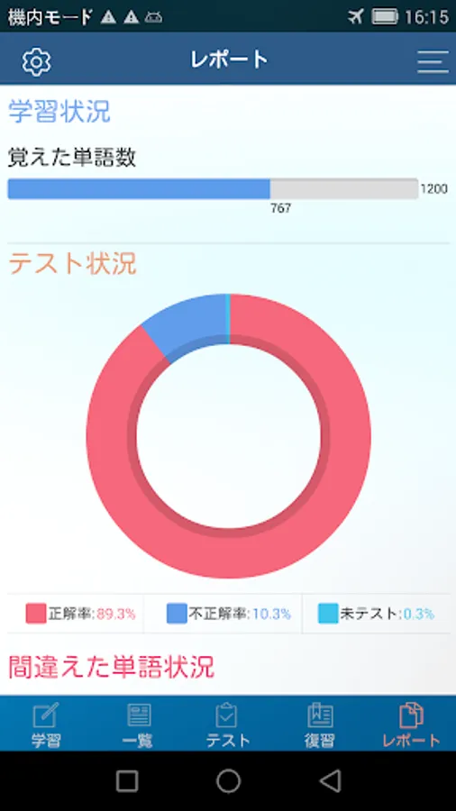· Charts based on the number of mistaken words are displayed, you can immediately check the word situation that became a learning problem.
