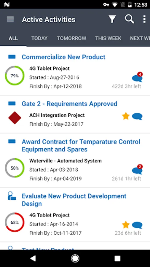 • Customize your activity list with built-in filters, including projects, WBS, status, location, due date, primary resource, and starred status.