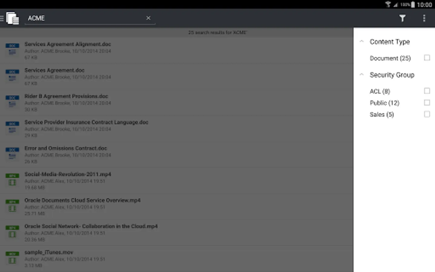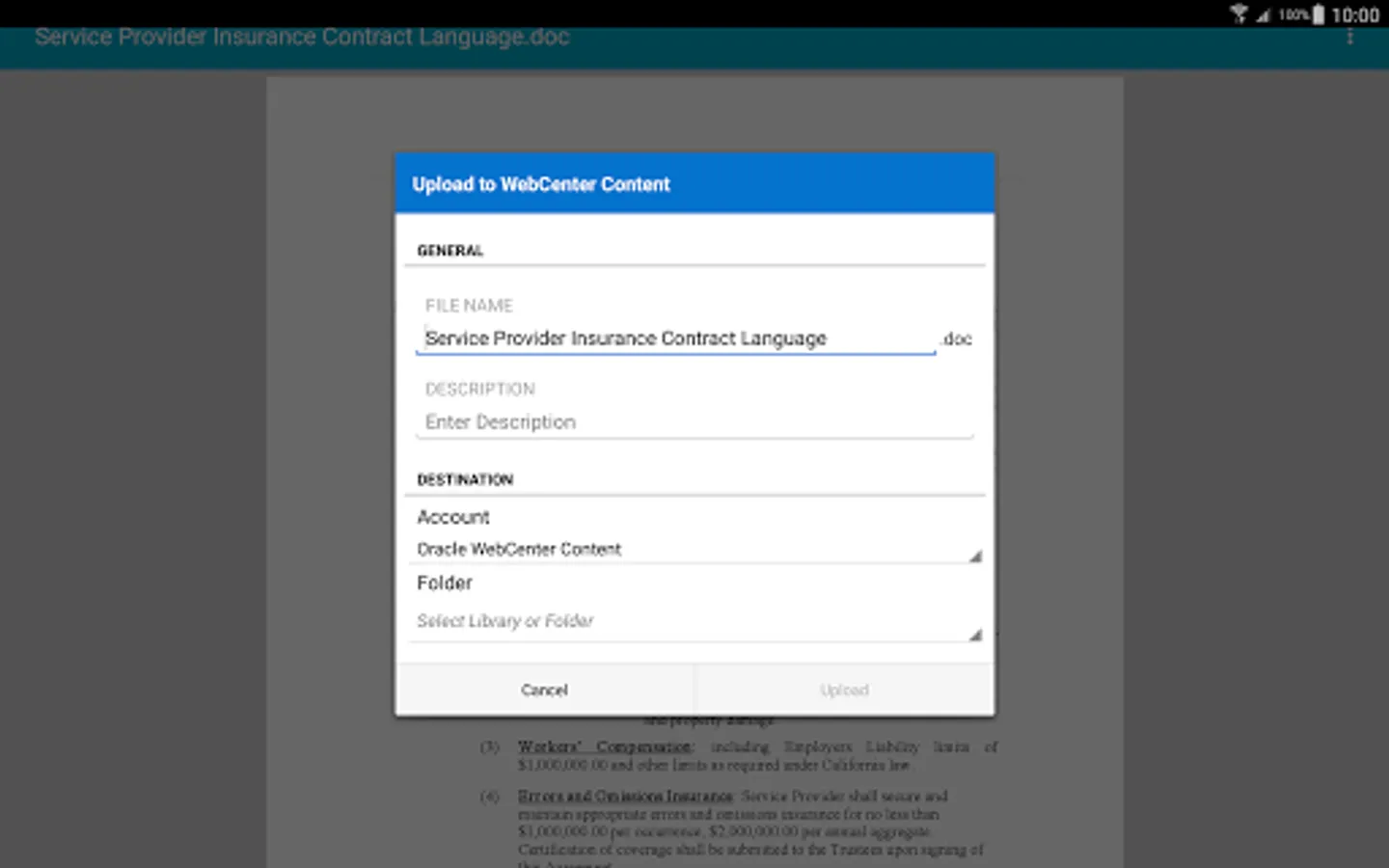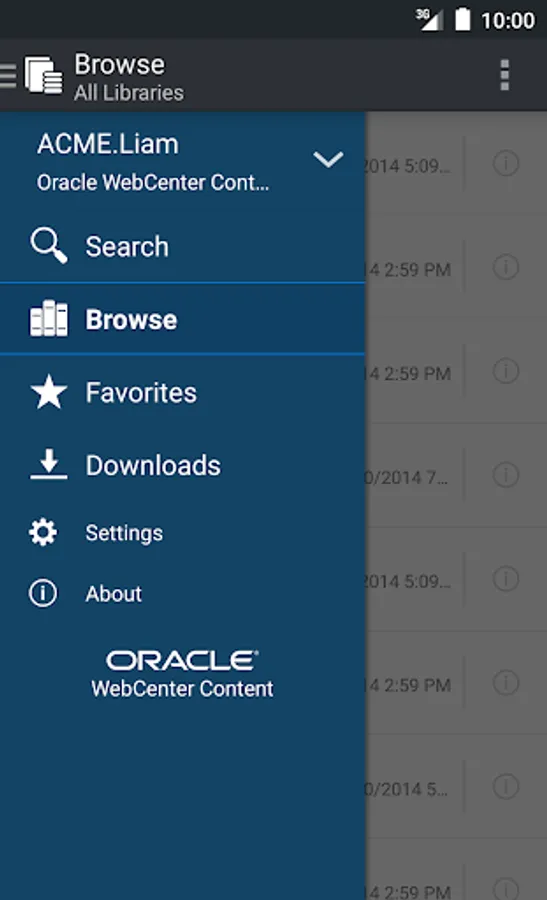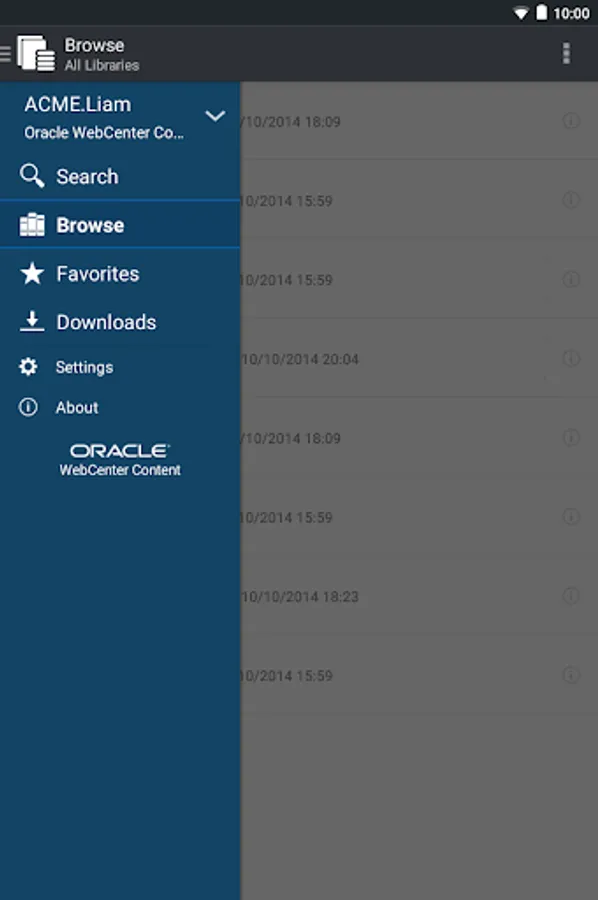 Oracle WebCenter Content for Android provides simple, secure access to your Oracle WebCenter Content environment, version 11.1.1.8.0 or higher. Users can easily browse, view, favorite and download important business documents from virtually anywhere. With the ability to download, critical files are stored locally and available with or without an Internet connection. Oracle WebCenter Content for Android ensures that your mobile workforce can stay informed and up-to-date with the most current information - ensuring better business decisions and faster resolution of issues.