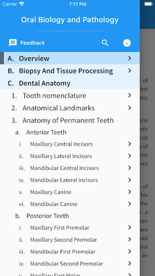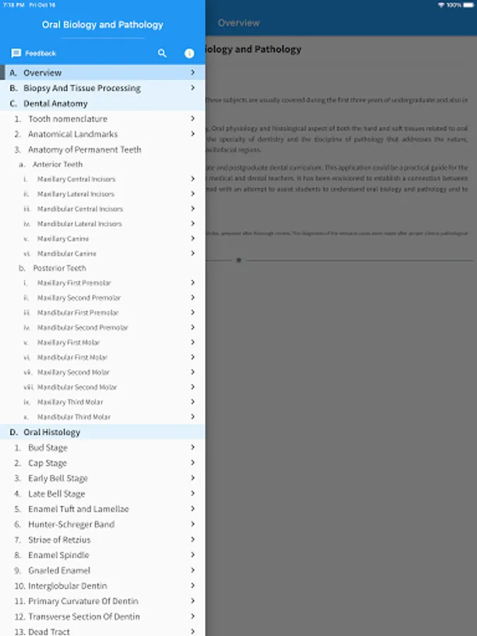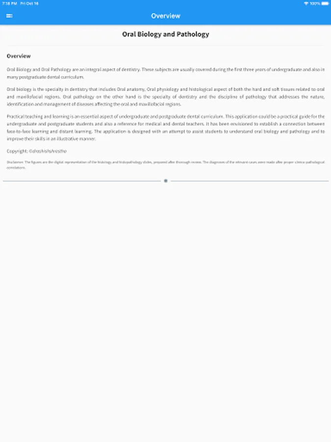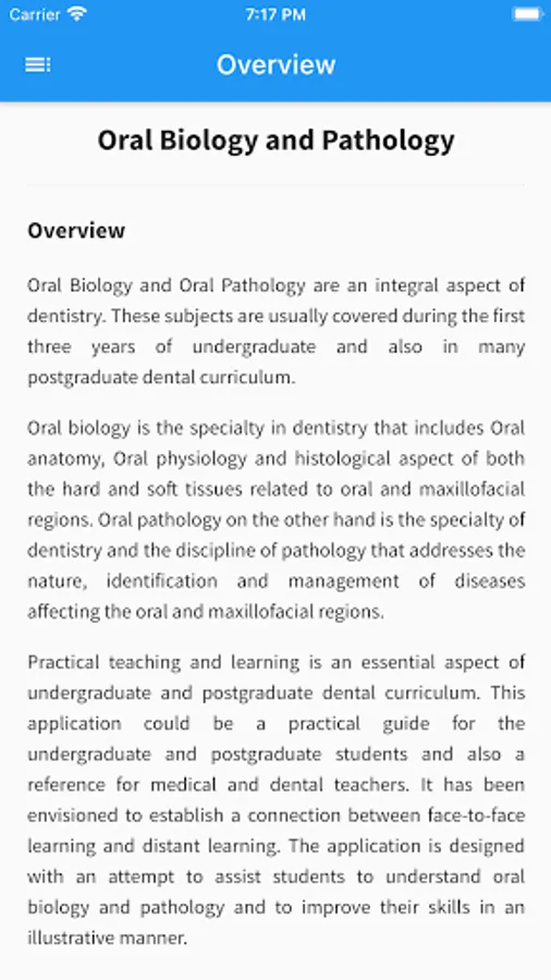 In this O-Bio-Patho app, we have tried to include component of oral anatomy, dental anatomy, biopsy and tissue processing, staining, oral histology and oral pathology. The app is divided into six sections. First section comprise of overview of the application, followed by description of biopsy and tissue processing. Dental anatomy section comprise of description of tooth nomenclature with examples, anatomical landmarks with its definition followed by detailed description and illustrative diagram of all aspect of permanent teeth. Oral biology and oral pathology section comprise of descriptions and illustrations of numerous hard and soft tissue specimens. Specimens of normal tissues and common oral and maxillofacial pathology cases are presented.