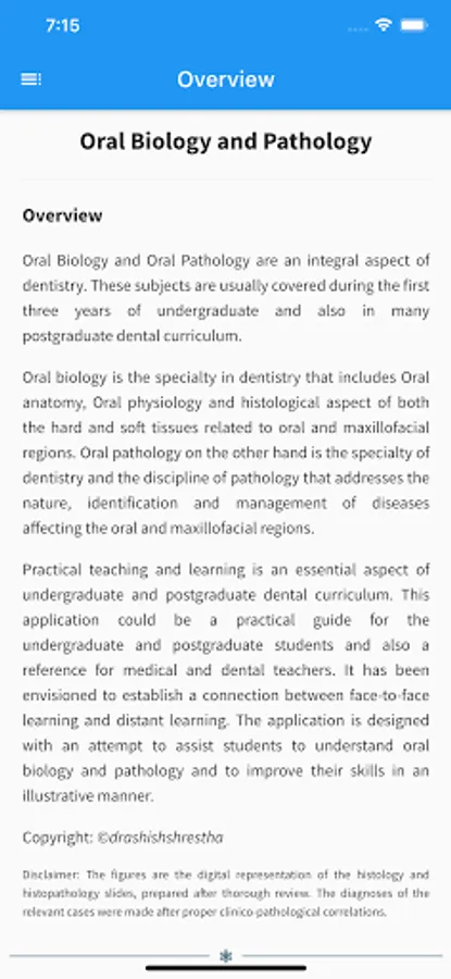 The description of the cases are obtained from standard text books and prepared after thorough discussion among the faculties. The diagrammatic illustrations are prepared following the representative microscopic focus of the slides corresponding with the colors of routine and special stains from the department. The illustrations are displayed with option to view with or without labels, which prepares the users for self-assessment. Users can post feedbacks related to the content and the design in the feedback section for possible betterment of this application.