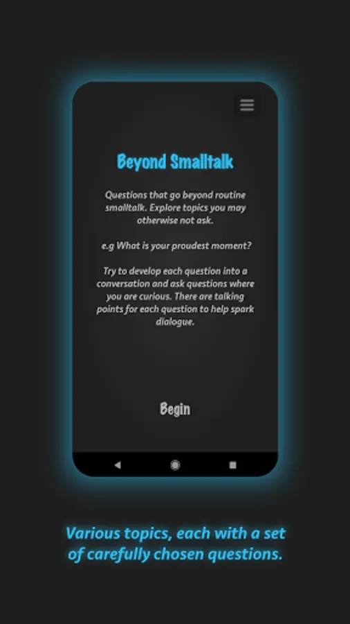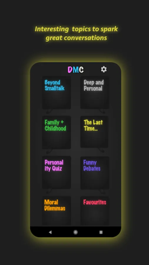 Choose from a variety of conversation topics, from deep questions about yourself to funny ones about random topics. Each topic has a series of carefully selected conversation starters to serve as the beginning of great conversations. Some conversation topics also have talking prompts to help with the flow of conversation.