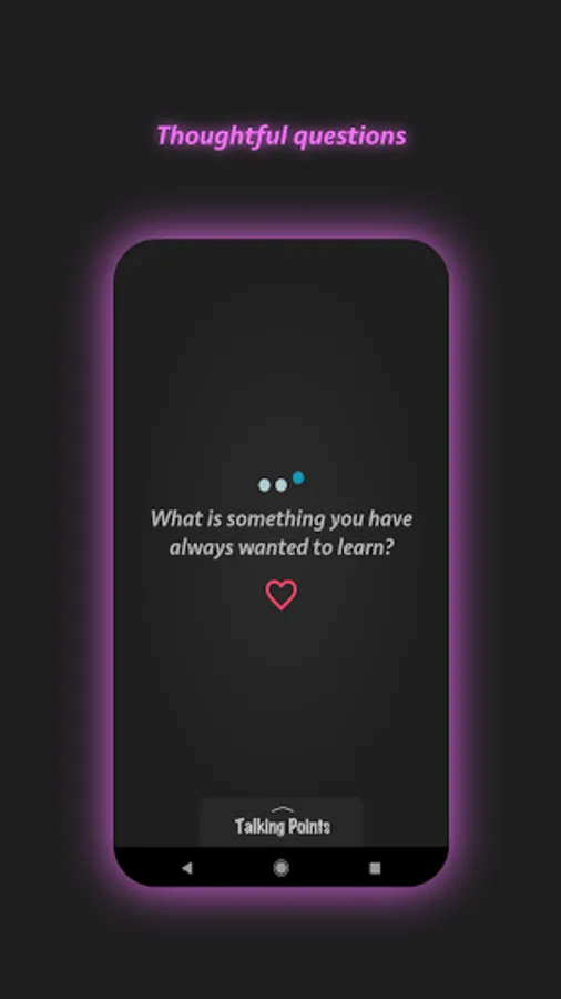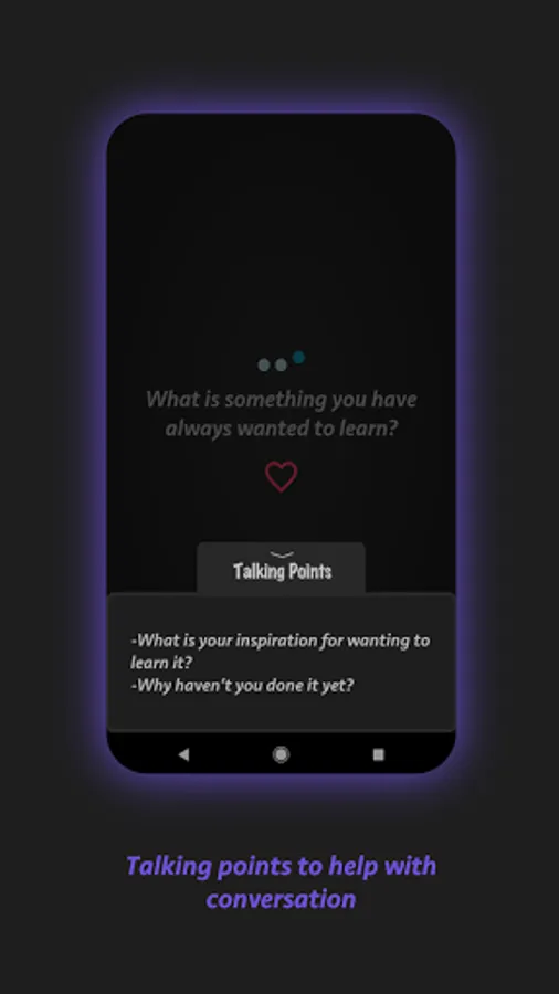 In a world filled with distractions, it can be hard to have meaningful conversations with the people around us. This application was created with the intention of sparking interesting, thoughtful and vulnerable conversations with others. We hope that this application can help make meaningful conversations easier by providing a collection of conversation starters that spark meaningful discussions and closer relationships.