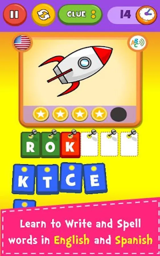Help kids learn how to spell and recognize words, in English and Spanish. With funny pictures, this game help improve her vocabulary skills every day.