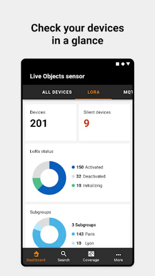 - display the status of a device and access to information (detail, MQTT/LoRa activity logs, payload messages, locations, intervention reports, traffic network and statistics,....)