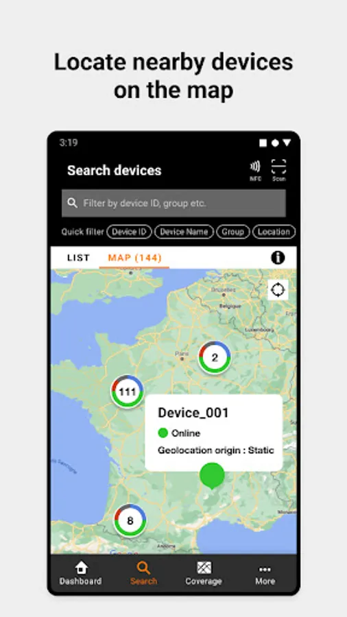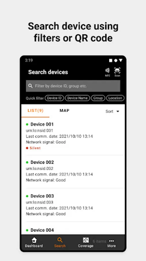 - access to the global view of the fleet of devices by connectivity (status, silent, group)