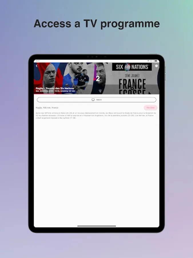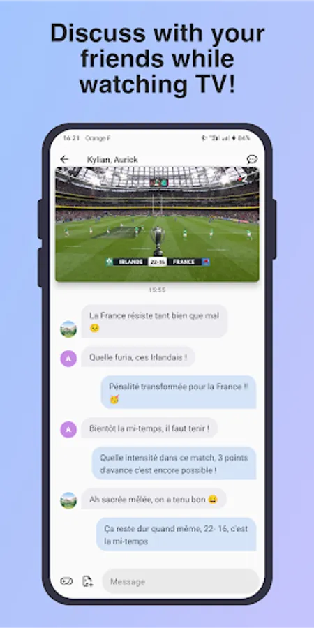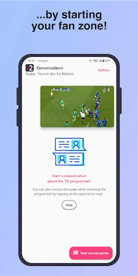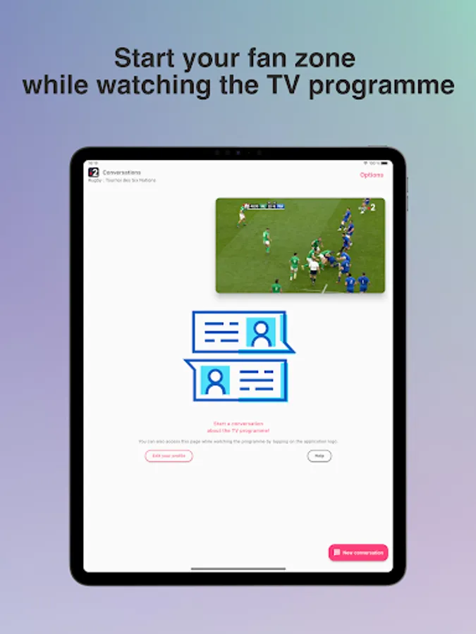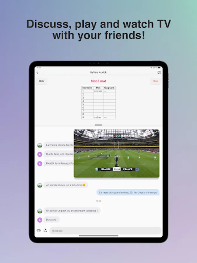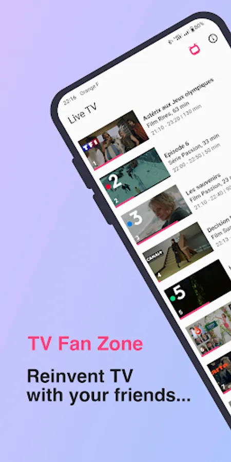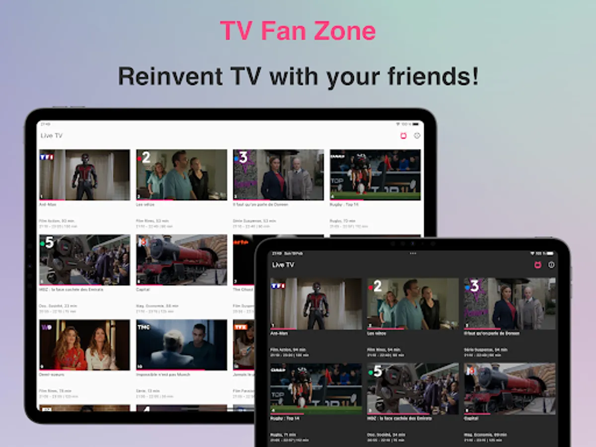 You are used to sharing on social networks your impressions about a TV programme, movie, talk or reality show. Or you simply enjoy evenings with friends or family in front of your TV, for example to vibrate together and share your feelings during sports broadcasts, but you do not have time to organise or your friends live far away? Discover the new live experience offered by TV Fan Zone! The application allows you to chat with your friends while watching the same TV programme in live, all within the same screen. For those who like gaming, they can benefit from an enriched experience thanks to our addictive games to play alone, in collaboration or to challenge with friends.