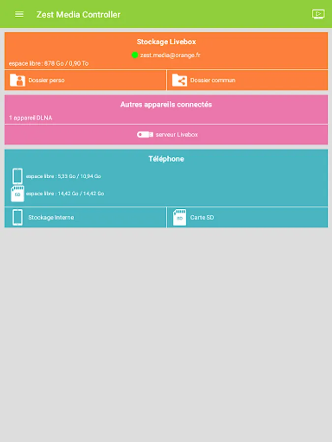 Zest Media Controller allows you to view and easily manage your mobile or tablet all the content stored on your connected devices (Livebox Storage, NAS, consoles ...) at home or remotely (4G or WiFi).