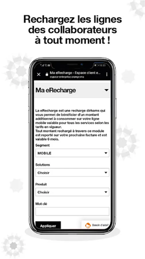 The Orange Pro application allows you to pay your bills, manage your mobile, landline and internet fleet, as well as top up employee numbers and enjoy numerous benefits at any time, with a few clicks and above all in complete autonomy.