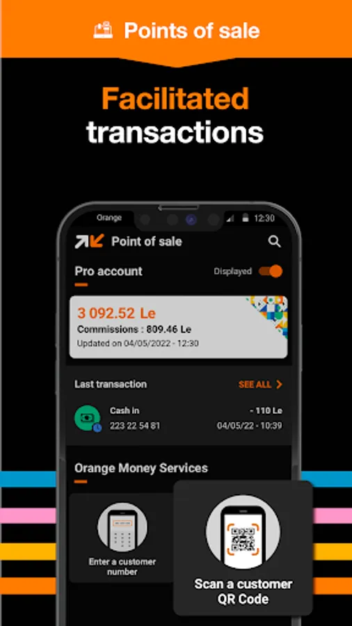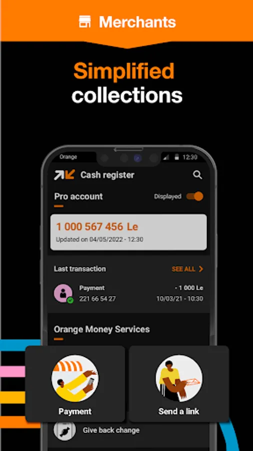 The Orange Money Pro mobile application offers digital payment with QR Code to allow merchant partners to efficiently manage their daily activity. It also offers cashin and cashout operations for Orange Money points of sale.