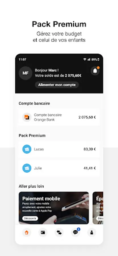 From 10 years old, a card and an App all their own to learn how to manage their budget: several possible payment methods (cards, Google Pay, SMS transfer), notifications for each purchase if you wish, the piggy bank to put aside and have fun by buying what they want themselves.